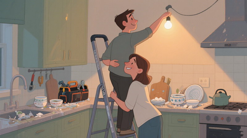 上个月我故意把灯泡拧松,晚上 “哎呀” 一声说灯坏了。他果然放下手机过来,嘟囔着 “你怎么什么都不会”,却认真地搬来梯子更换。灯光亮起的瞬间,我从背后抱住他:“好久没看你干活了。” 他身体僵了一下,轻轻回抱了我。