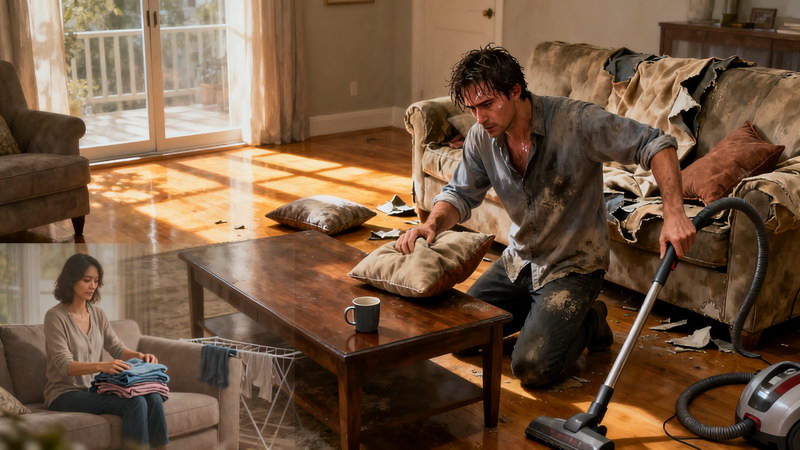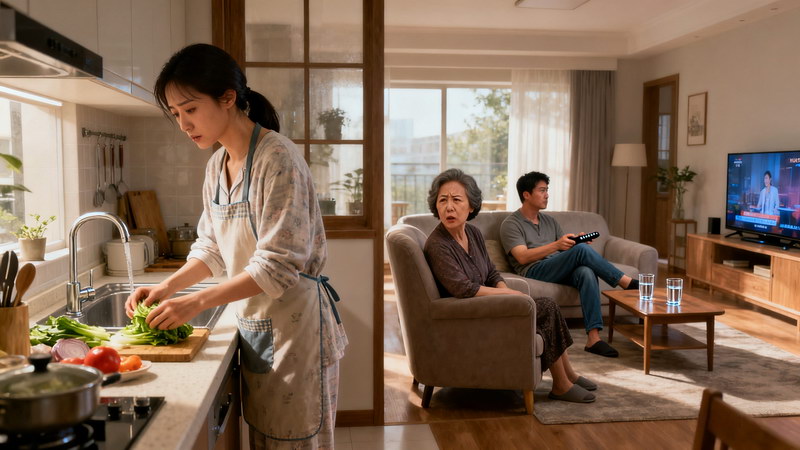 心理学上还有个概念叫 “过度代偿效应”:当一个人试图通过包揽所有责任来维持关系稳定时,反而会让对方逐渐丧失承担能力,最终形成 “一方过度付出,一方彻底躺平” 的失衡局面。 [此处插入写实、超清插图 3,画面为妻子忙家务累倒在沙发上,丈夫却坐在旁边无动于衷地玩手机]