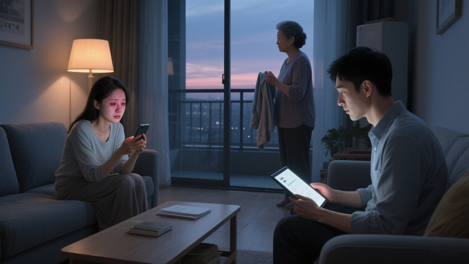 (此处插入第二幅写实风格插图:傍晚的客厅,灯光昏暗。女人坐在沙发上,手里拿着手机,屏幕上是妈妈住院的消息,眼睛红红的,想跟旁边的男人说话,却又把话咽了回去;男人坐在沙发的另一端,手里拿着平板电脑,假装看文件,却时不时用余光瞟女人,脸上带着逃避的表情;不远处的阳台,婆婆站在那里,手里拿着一件衣服,却没在晾,而是在偷听他们说话。整个画面充满了 “装聋作哑” 的隔阂感)