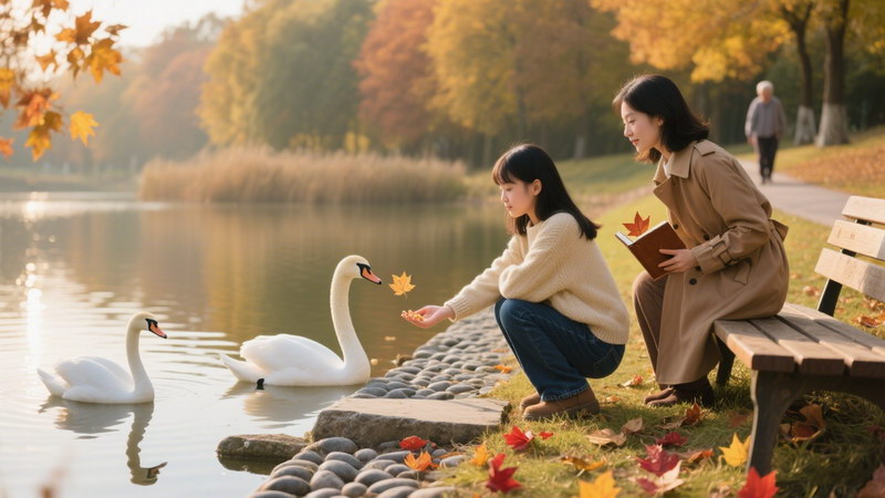 到了公园,我没有催她 “快一点”,也没有说 “你看小时候多开心”,只是跟着她的脚步慢慢走。她蹲在湖边看天鹅,我就陪她一起看;她捡起一片枫叶发呆,我就帮她把枫叶夹进笔记本里;她坐在长椅上不说话,我就静静地坐在她旁边,偶尔跟她聊一句 “今天的风好舒服”“你看那只天鹅的羽毛真白”。