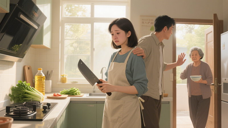 (此处插入第一幅写实风格插图:周末的厨房,阳光透过窗户照进来。女人系着围裙,手里拿着菜刀,站在灶台前,眉头微微皱着,眼神里带着委屈;男人站在女人旁边,一只手搭在女人的肩膀上,另一只手对着门口的婆婆摆手,脸上带着温和却坚定的表情;门口的婆婆手里拿着一个碗,脸上带着不满,却没再往前走。灶台上,放着切好的青菜和一瓶食用油,整个画面充满了 “有人护着” 的安全感)
